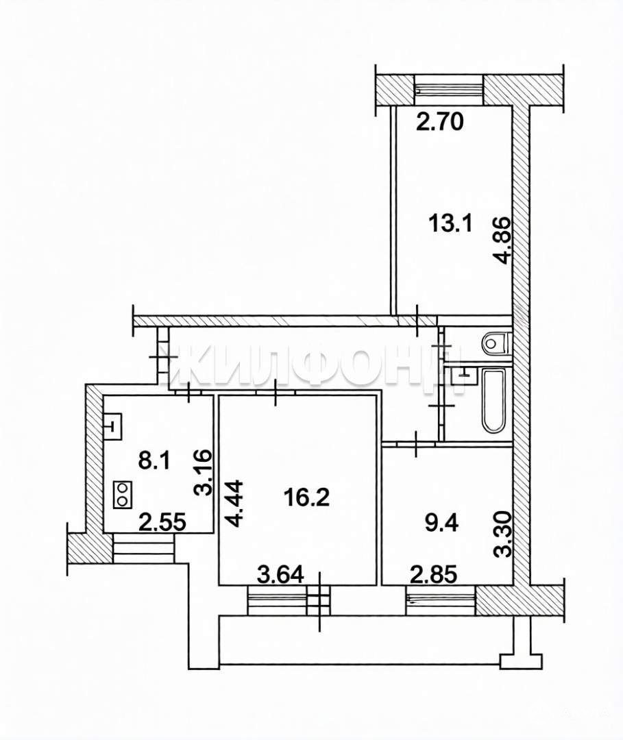 Кухня площадью 8, 1 квадратных метра достаточно просторна для комфортного приготовления пищи и совместных трапез. Ванная комната составляет 2, 6 квадратных метра, а туалет - 1, 3 квадратных метра. Коридор площадью 11, 0 квадратных метра обеспечивает удобный доступ ко всем помещениям квартиры.